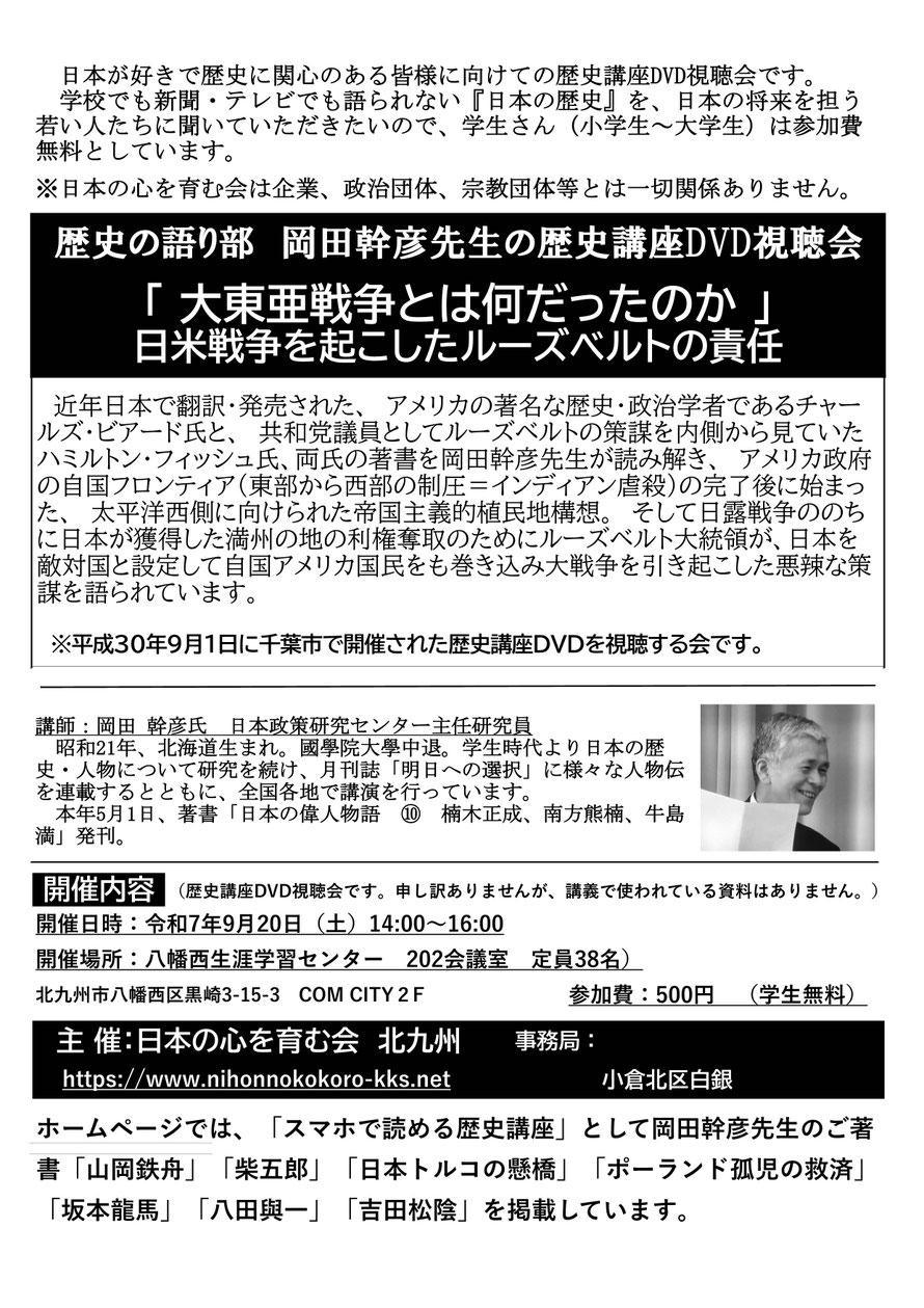 9月20日(土)14:00~16:00 DVD歴史講座「大東亜戦争とは何だったのか 日米戦争を起こしたルーズベルトの責任」を開催しました。
