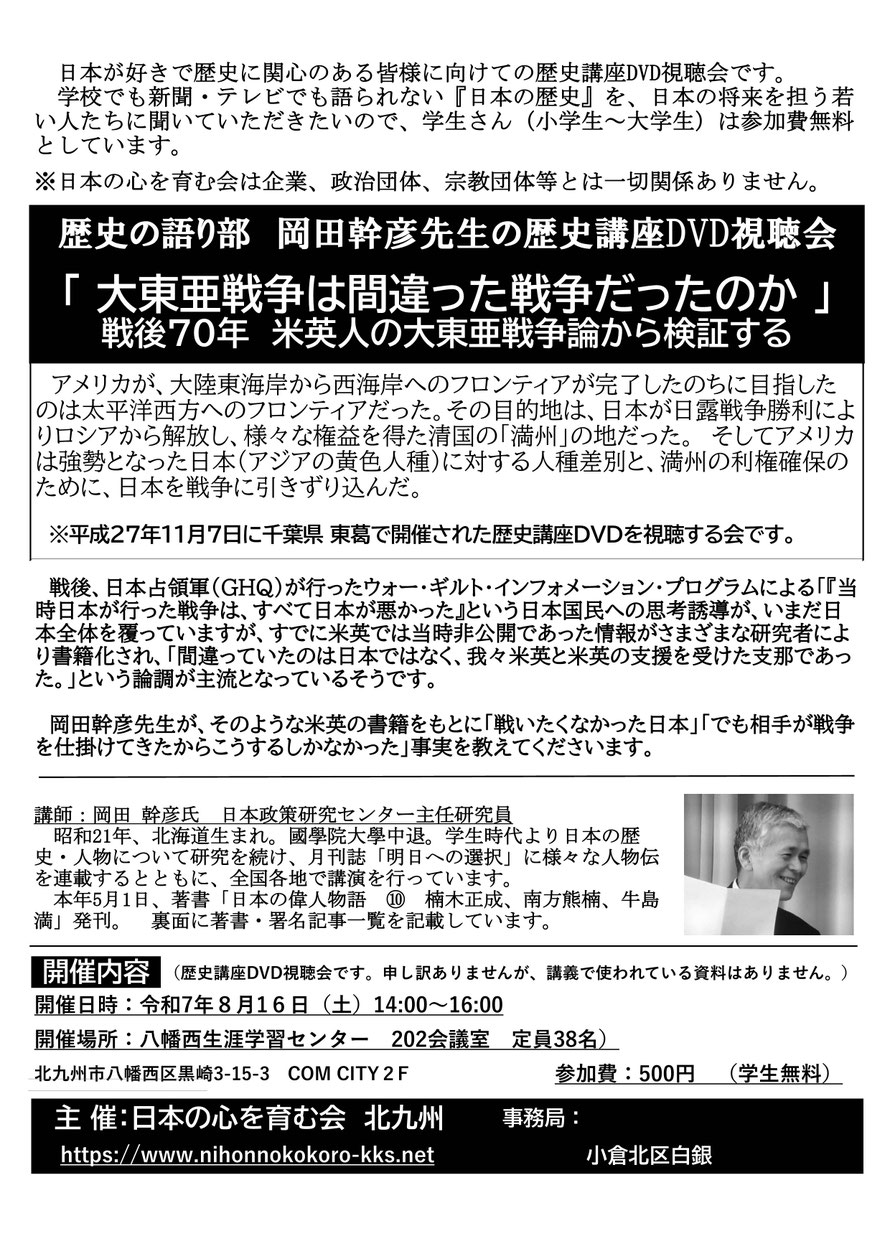 8月16日(土)14:00~16:00 DVD歴史講座「大東亜戦争は間違った戦争だったのか」を開催しました。
